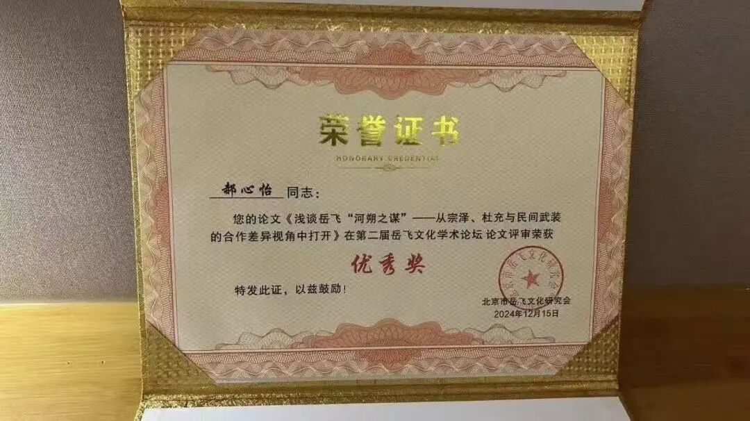 郝心怡同学在第二届岳飞文化学术论坛中,跳出对岳飞经典战役的传统叙事框架,将研究视角转向其军事战略的大局观内核,以"河朔之谋"为切入点展开深度论述。她从"河朔之谋"的内容构成解析岳飞"联结河朔"的战略构想,整段论述以史料为基、以逻辑为纲,从具体战略内容到学术创新价值层层递进,在娓娓道来的论证中展现出对历史议题的独特解读力。