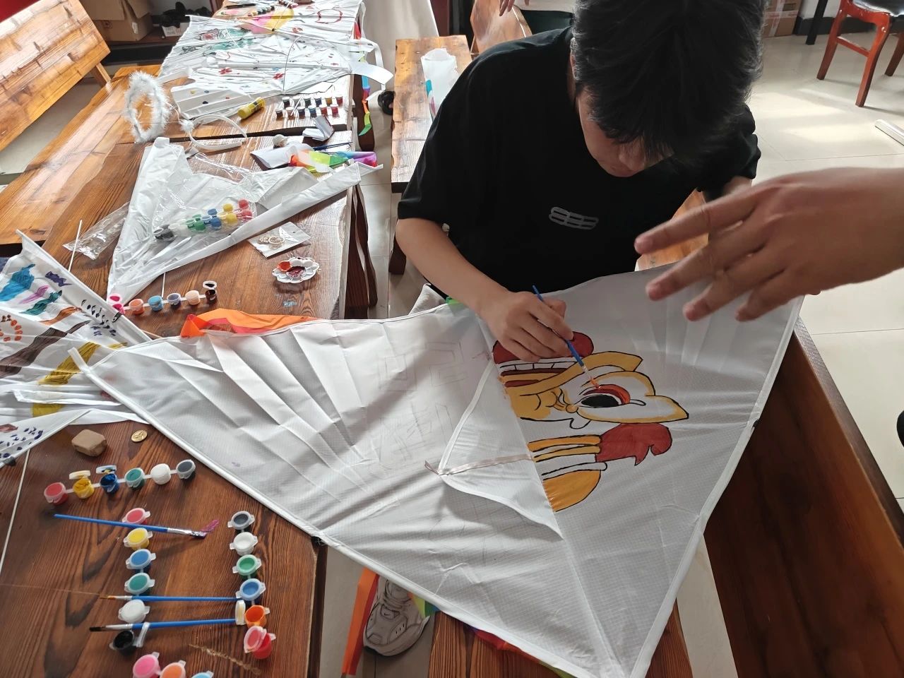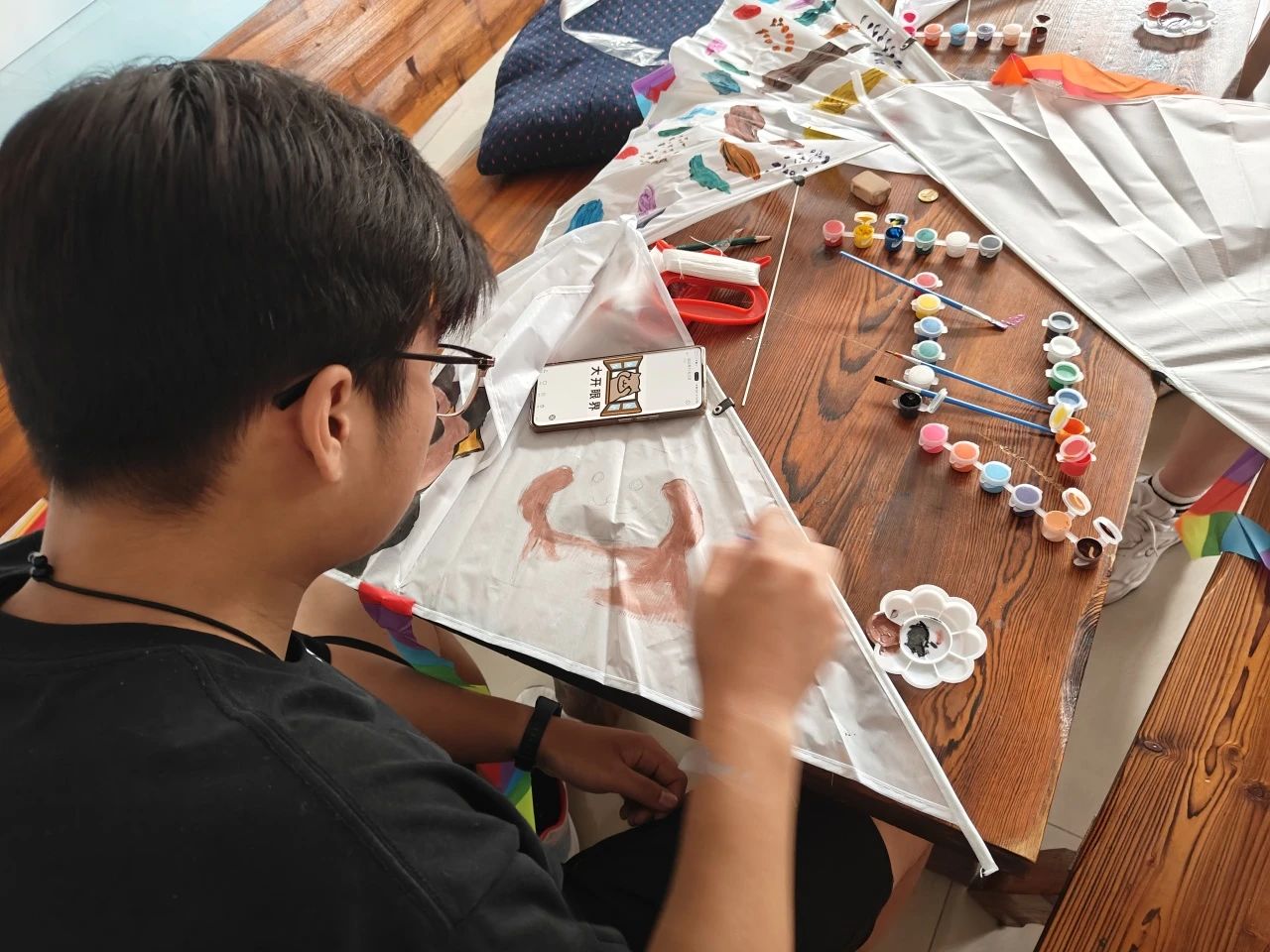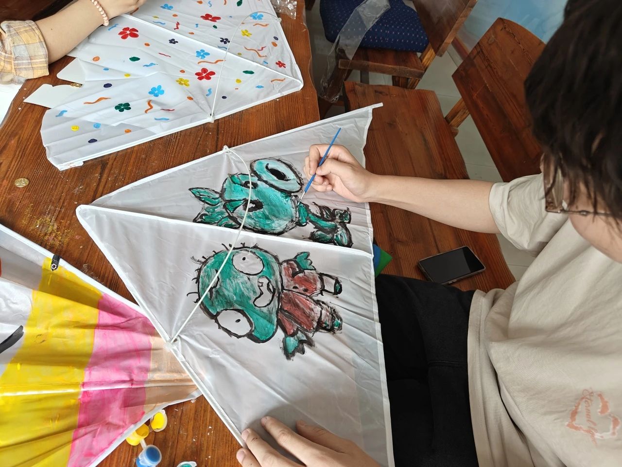 在动手环节,同学们释放内心的艺术家,大胆地在风筝上涂抹着春天的色彩。每一笔、每一划,都是对春天独特见解的展现,每一面风筝都成为了个性与创意的完美载体。