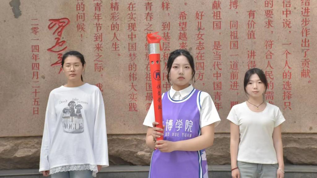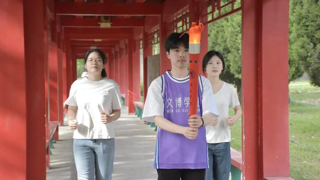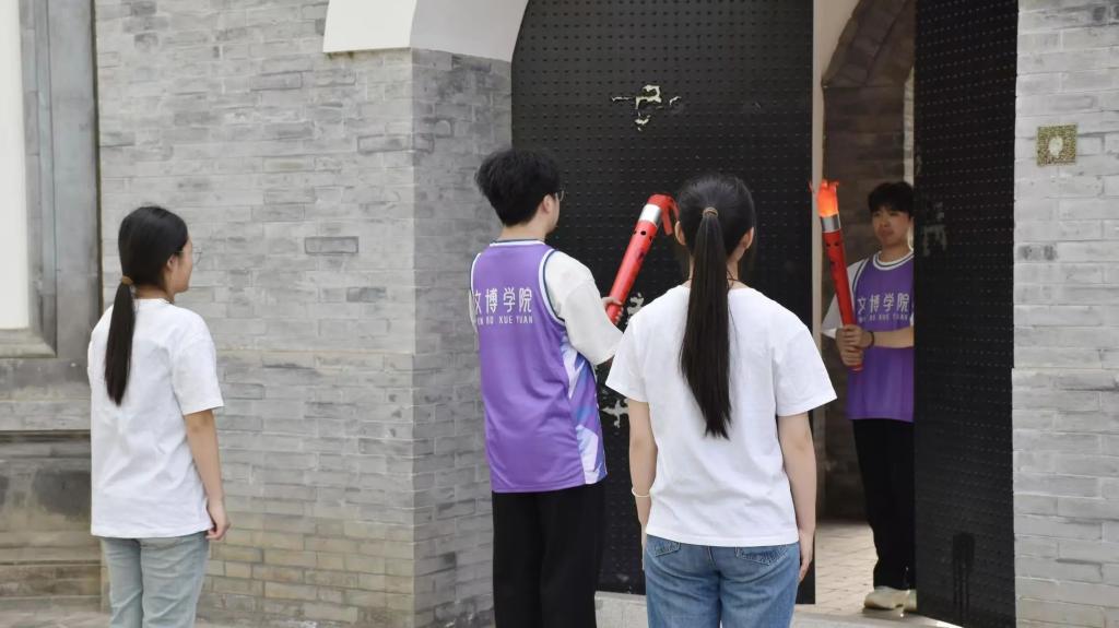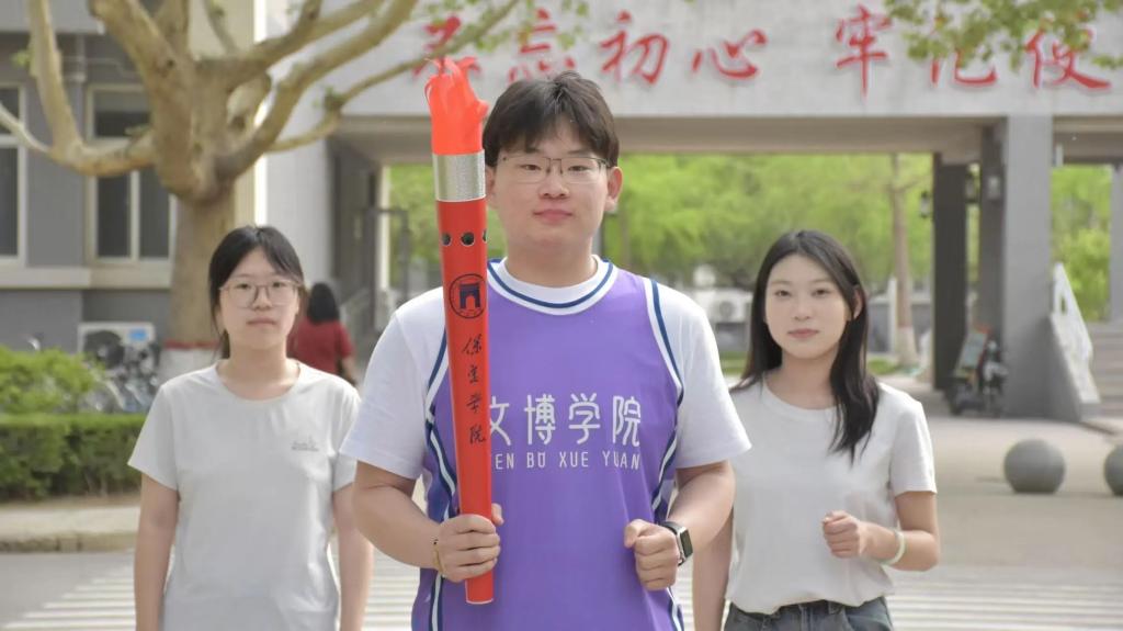 第二棒主火炬手薄伟,副火炬手张润佳、聂初雨。他们从理科楼门洞接过火炬,沿着森林公园路线,抵达文物绘图室。绘图室里,火炬手们参观了解文物绘图工具,体验绘图流程,见证古人对文物记录的智慧,体悟文物背后的故事,领略精益求精的工匠精神,让历史文化在手中生动展现。
