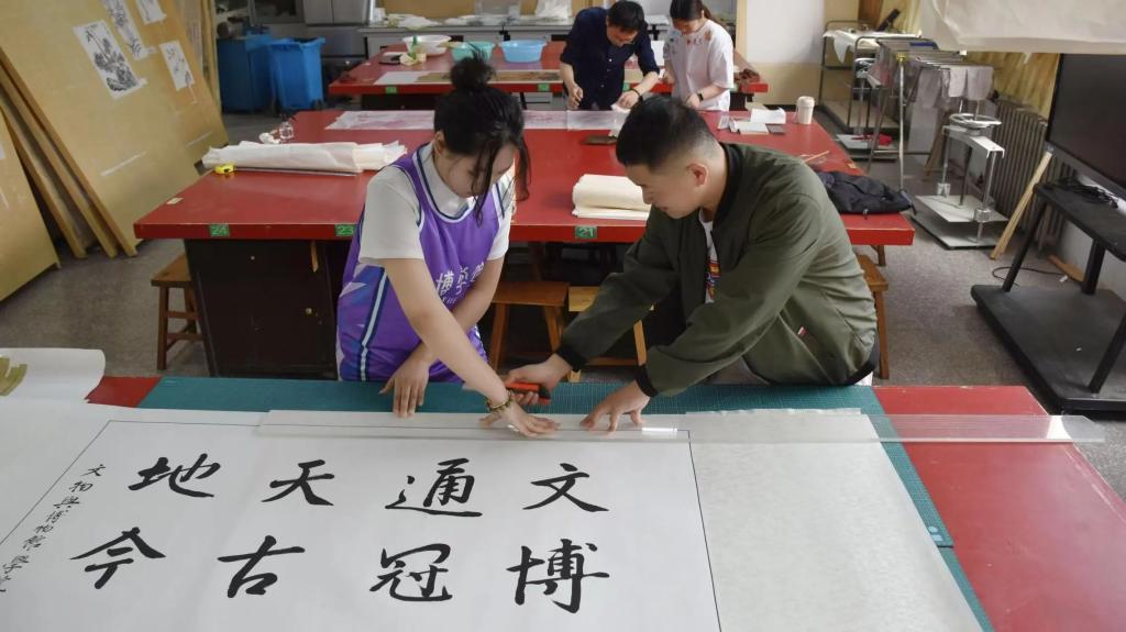 第一棒主火炬手马昱美池,副火炬手谭思敏、殷美妍。他们作为员工代表,肩负着开启文化传承之旅的重任。从回信石出发,火炬手们前往装裱室。宋朝是中国文化艺术发展的高峰时期,装裱室作为书画艺术的守护者,承载着对美的追求和对文化的尊重。在装裱室,他们在专业同学的指导下,参与体验书画装裱流程,了解装裱知识。开启了此次活动“薪火溯千年”的篇章。