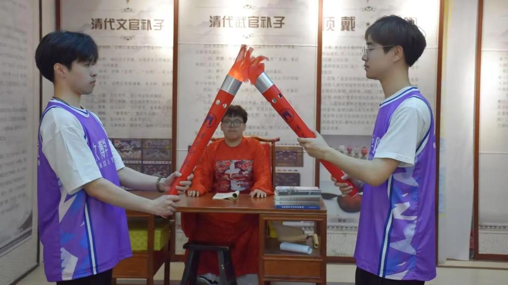 第三棒主火炬手刘靖燚,副火炬手宋浩然、陈晓蒙。他们从文物绘图室楼门口出发,绕实训大楼,最终到达衙署文化中心。在这里,设置了仿清文书,火炬手书写相关文字并进行朱批确认,这一举动不仅是对清代文书制度的致敬,更是对文化传承与创新精神的深刻诠释。